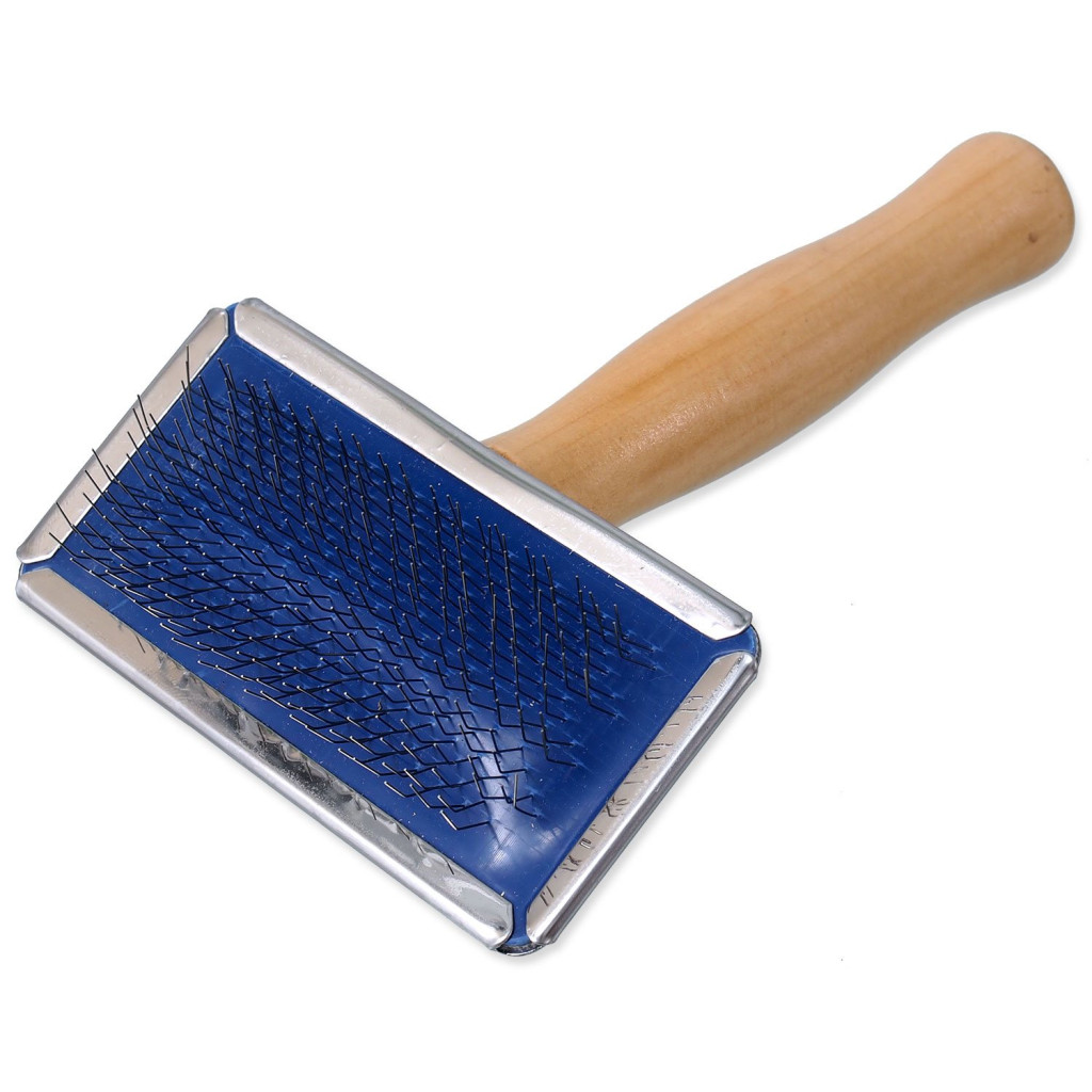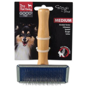 Dotaz na produktKartáč s kovovými drátky a dřevěnou rukojetí pro střední psy.