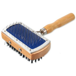 Dotaz na produktDřevěný oboustranný kartáč pro malé a střední psy.