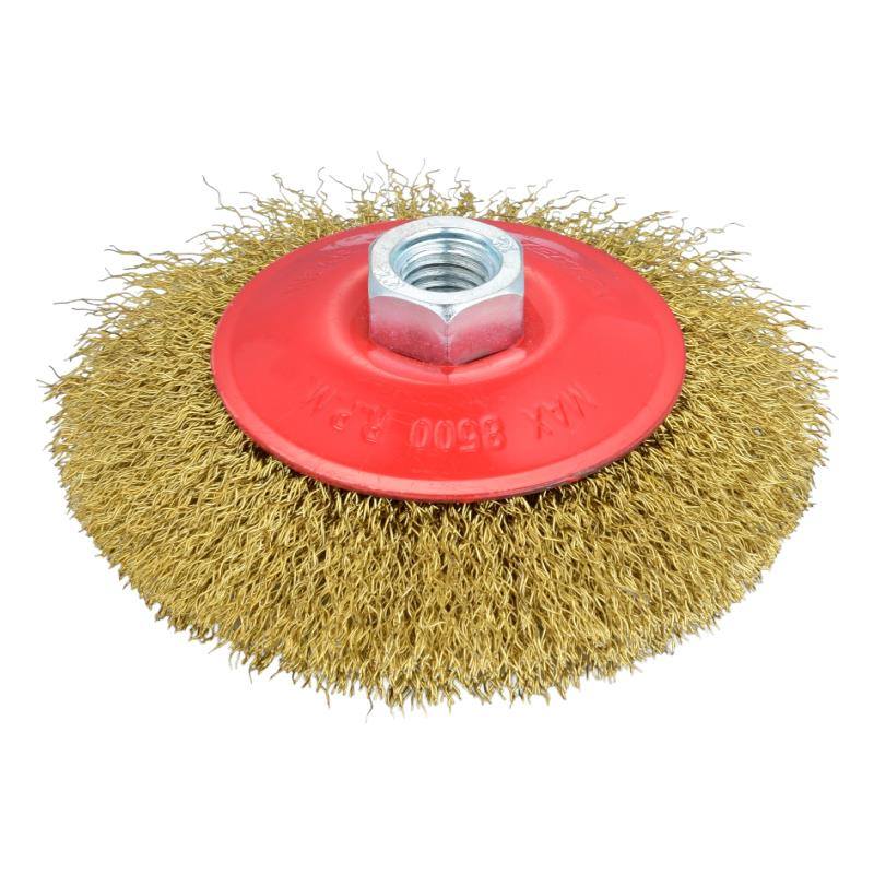 kartáč miskový - vlnitý ENPROse závitem do úhlové brusky M14 xvhodný pro odstraňování barev, rzi, otřepů a zbytků po sváření a jiných nečistotprůměr drátu: 0,3 mm (pomosazený drát)