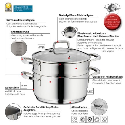 Sofistikované detaily, jako je ohnutý okraj, se postarají o snadnou manipulaci a o čistou práci při odlévání, zatímco vnitřní stupnice zjednoduší měření - absolutně bez dalšího příslušenství. Speciálně tvarované rukojeti se zredukovaným průřezem garantují zároveň příjemnou teplotu při držení.