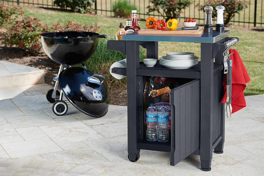 UNITY 105 L je moderní mobilní skříňka, kterou oceníte především při grilování! Skříň s úložným prostorem, vybavená funkční nerezovou deskou a praktickou rukojetí s háčkem na ručníky, bude dobře fungovat při důležitých rodinných setkáních na terase nebo na zahradě.