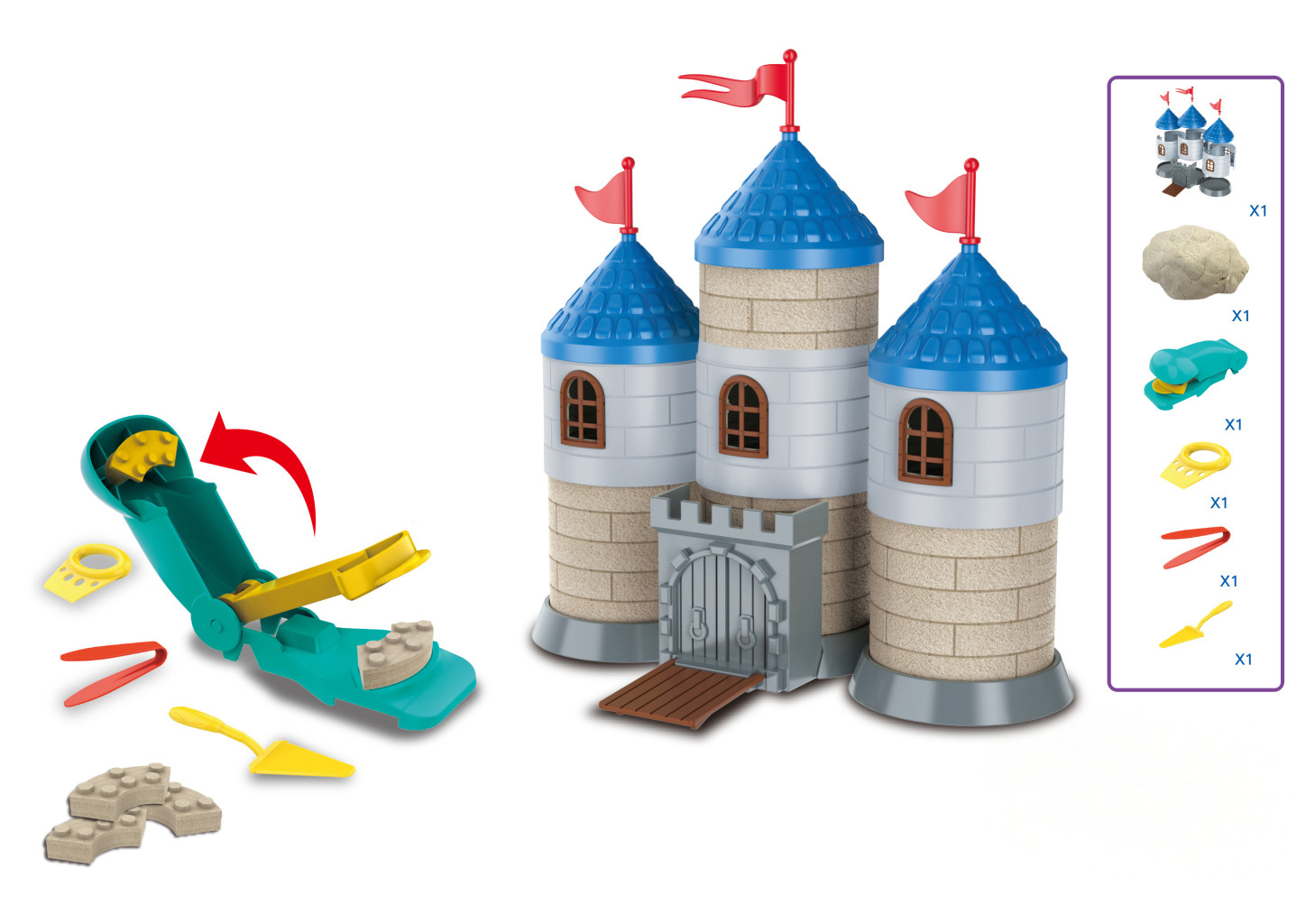 Dotaz na produktKinetický písek sada na stavbu s cihliček Hrad. Obsah balení 750g. Obsahuje formu na tvorbu cihliček. Balení také obsahuje díly na stavbu hradu a další nástroje na práci s pískem. Obrázkový návod na zadní straně obalu. Po vytažení z formičky nechejte písek 1 minutu schnout. Pokud potřebujete menší cihličku, rozkrojte větší na půl, pomocí přiloženého nástroje.