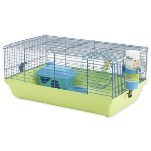 Klec je vybavená plastovým domečkem, miskou na krmení, kolotočem a napaječkou.