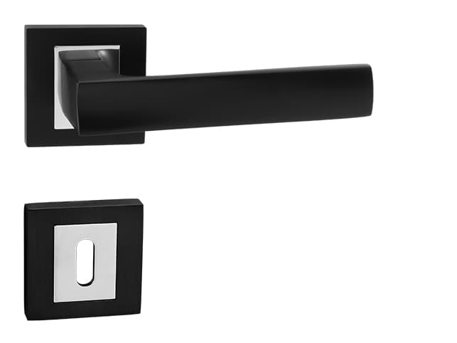 Dotaz na produktDesignová klika na hranatých rozetách za přijatelnou cenu vhodně doplní nejen skladové dveře Naturel. Barevné provedení černé matné/chrom. Spodní rozeta na dozický klíč. Lze dodat i v provedení Nikl Perla.