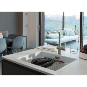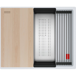 Fragranitový dřez Kubus 2. Cena zahrnuje: Sítkový ventil 3 1/2" s přepadem a nerezovou krytkou ventilu. Sifon pro úsporu místa 6/4 “ s odbočkou na myčku nádobí. V ceně dřezu doplňky: miska, přípravná deska a rolovací rošt.