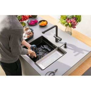 Fragranitový dřez Kubus 2. Cena zahrnuje: Sítkový ventil 3 1/2" s přepadem a nerezovou krytkou ventilu. Sifon pro úsporu místa 6/4 “ s odbočkou na myčku nádobí. V ceně dřezu doplňky: miska, přípravná deska a rolovací rošt.