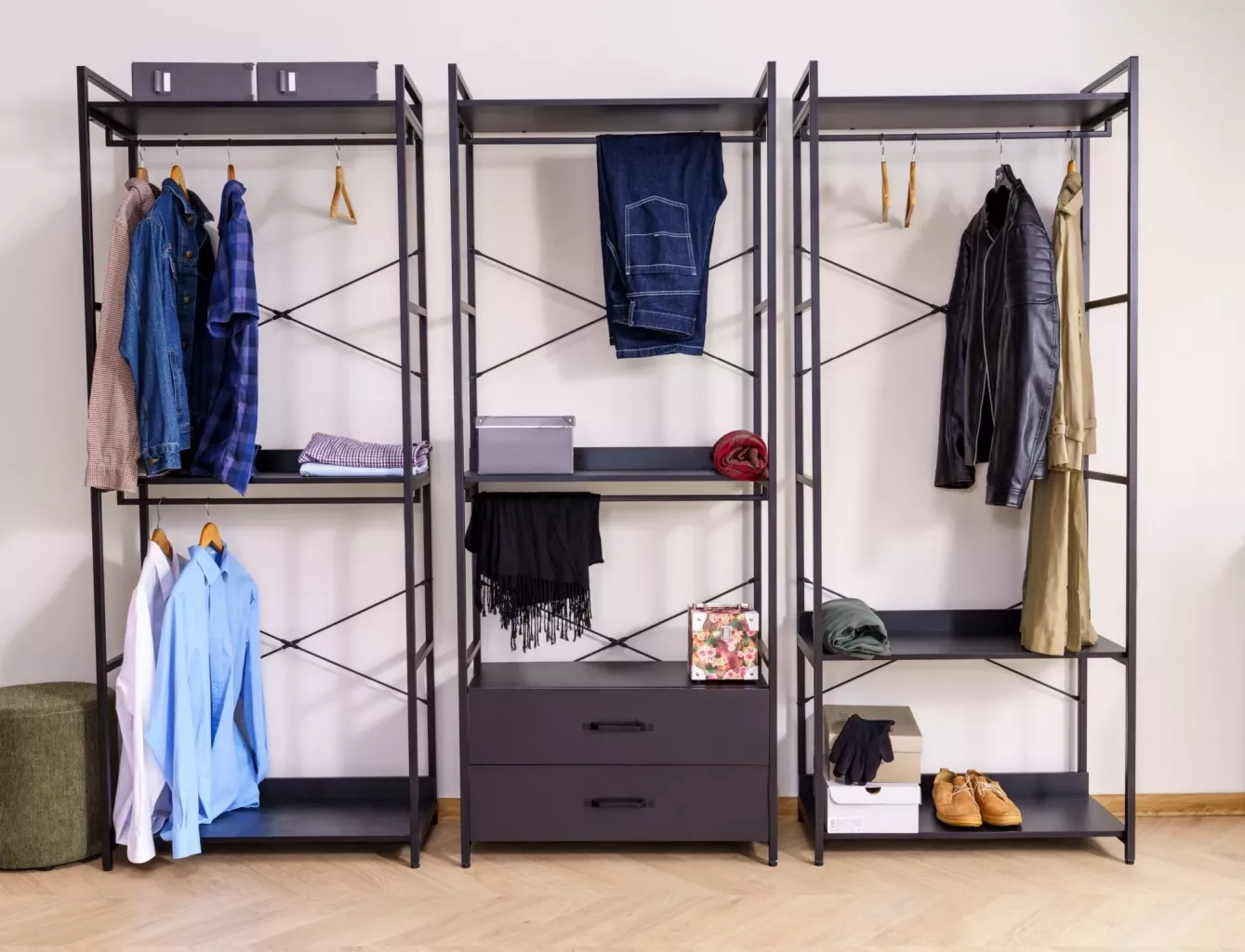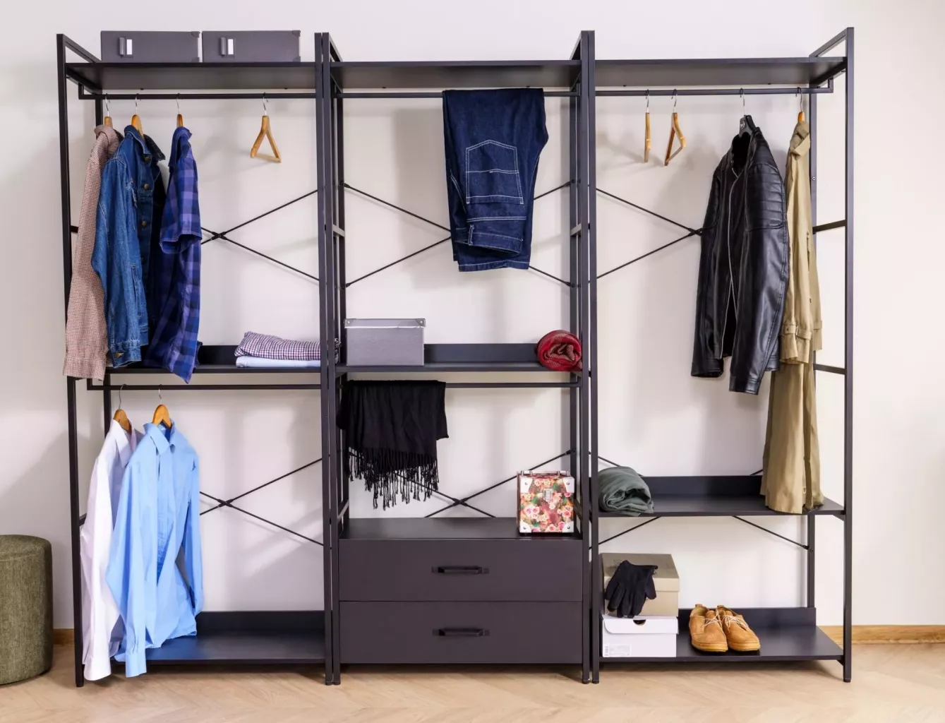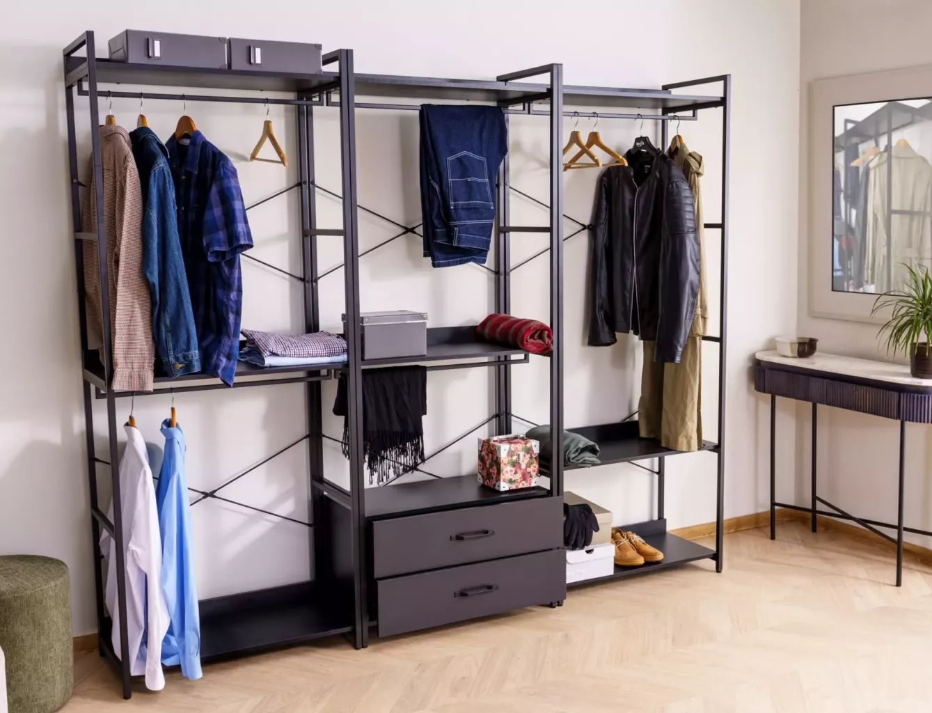 Dotaz na produkt Na splátky ještě dnesPolice/věšák, police: laminovaná deska, rám: kov, barva: černá/matná černá. Uzamykatelná skříňka s policí.
