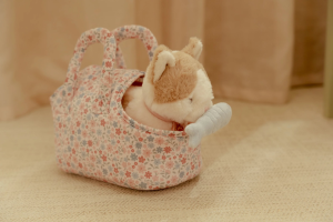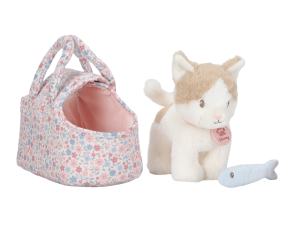 Kočička přichází v elegantní květované tašce s předním otvorem, aby mohla zvědavě vykukovat ven. Díky tomu si ji děti mohou vzít kamkoli – na procházku, na výlet, do školky nebo třeba k prarodičům. Na krku má přívěsek se svým jménem. Plyšová rybka na hraní má uvnitř magnet, takže drží kočičce u tlamičky.