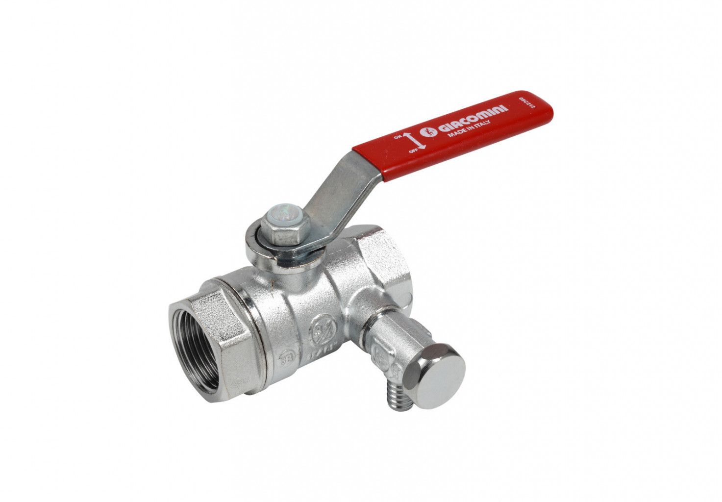 Kulový kohout s vnitřními závity, vypouštěním a ovládací páčkou - červená, chromovaný.