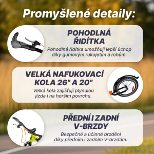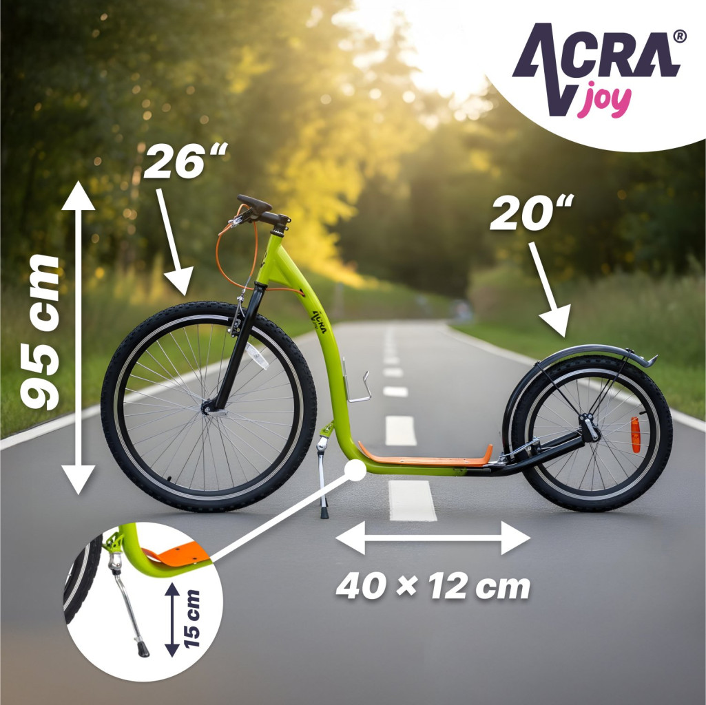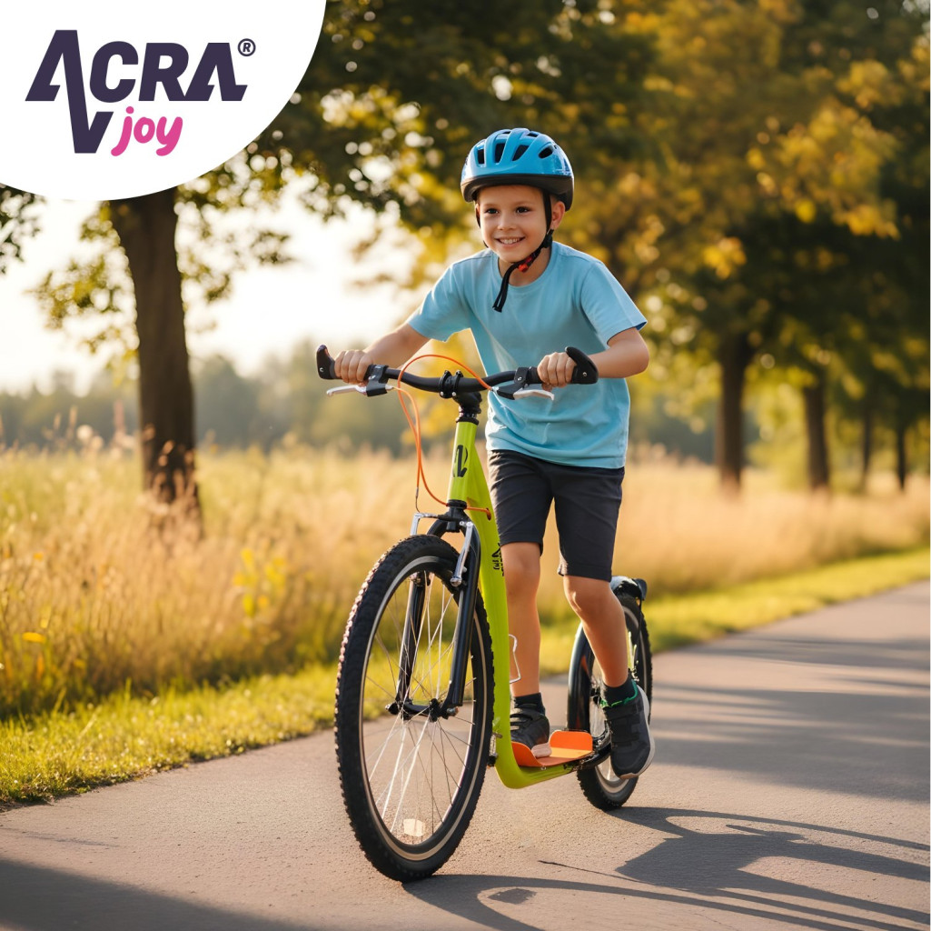 Koloběžka Acra Joy Racer je rychlá, sportovní, ideální pro jízdu po silnici, cyklostezce i v menším terénu. Je vhodná pro jezdce všech úrovní a je ideální nejen pro dojíždění do práce nebo školy, ale i pro zábavu a volný čas i pro výlety do terénu.