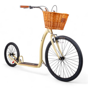 Stylový proutěný košík na přední části není jen estetickým doplňkem – je skvělý na všechny vaše nezbytnosti, ať už jde o kabelku, nákup nebo třeba piknikovou deku. Dřevěné stupátko nabízí komfortní prostor pro nohy a zároveň vypadá stylově, což dodává koloběžce nádech elegance.