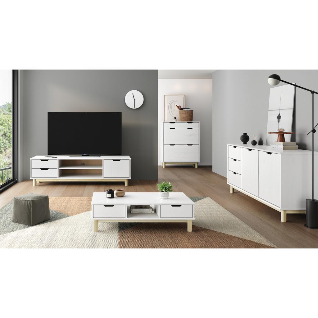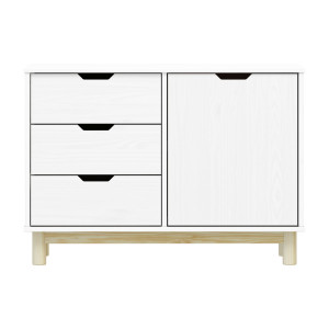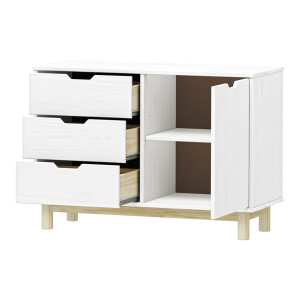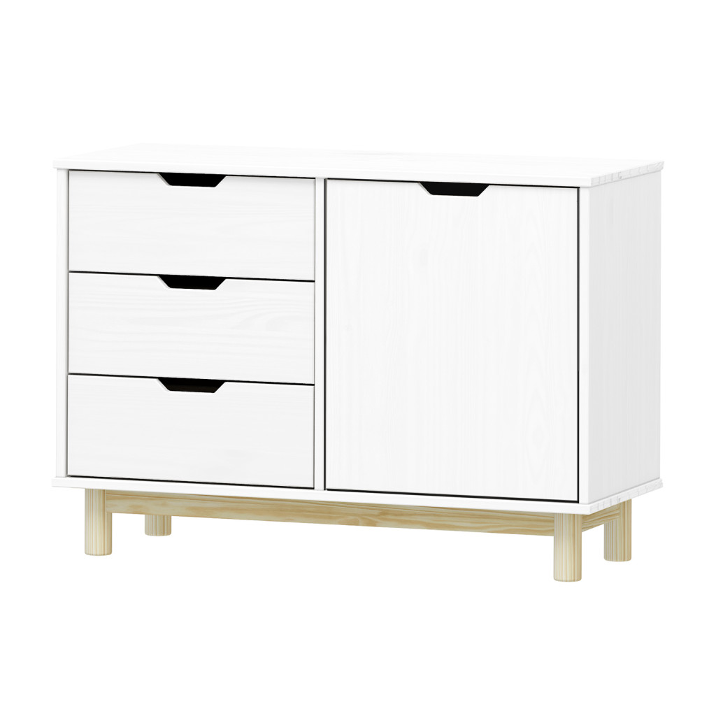 Dotaz na produkt Na splátky ještě dnesmateriál masiv borovice, barevné provedení bílý lak 3 zásuvky s kovovými pojezdy, 1 dvířka, 1 police