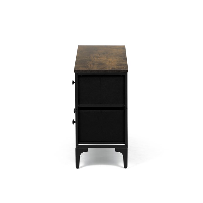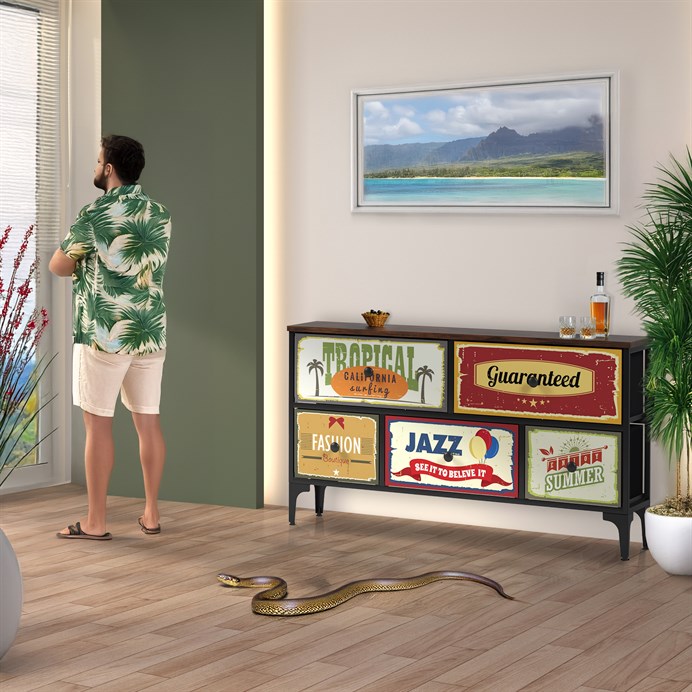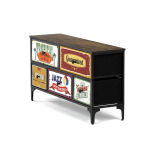 Dotaz na produkt Na splátky ještě dnesRetro komoda značky Autronic přinese do vašeho interiéru jedinečný styl a originalitu. Textilní čela zásuvek s výplní HDF a vintage potiskem navozují atmosféru starých amerických barů a jazzových klubů. Kombinace černé kovové konstrukce, desky v dekoru starého dřeva a zdobných noh dodává nábytku robustní, ale zároveň elegantní vzhled. Korpus zásuvek je vyroben z netkané textilie s výplní MDF, což zajišťuje jejich lehkost a snadnou manipulaci. Ideální doplněk do obývacího pokoje nebo stylové kavárny, kde se stane nepřehlédnutelným prvkem.