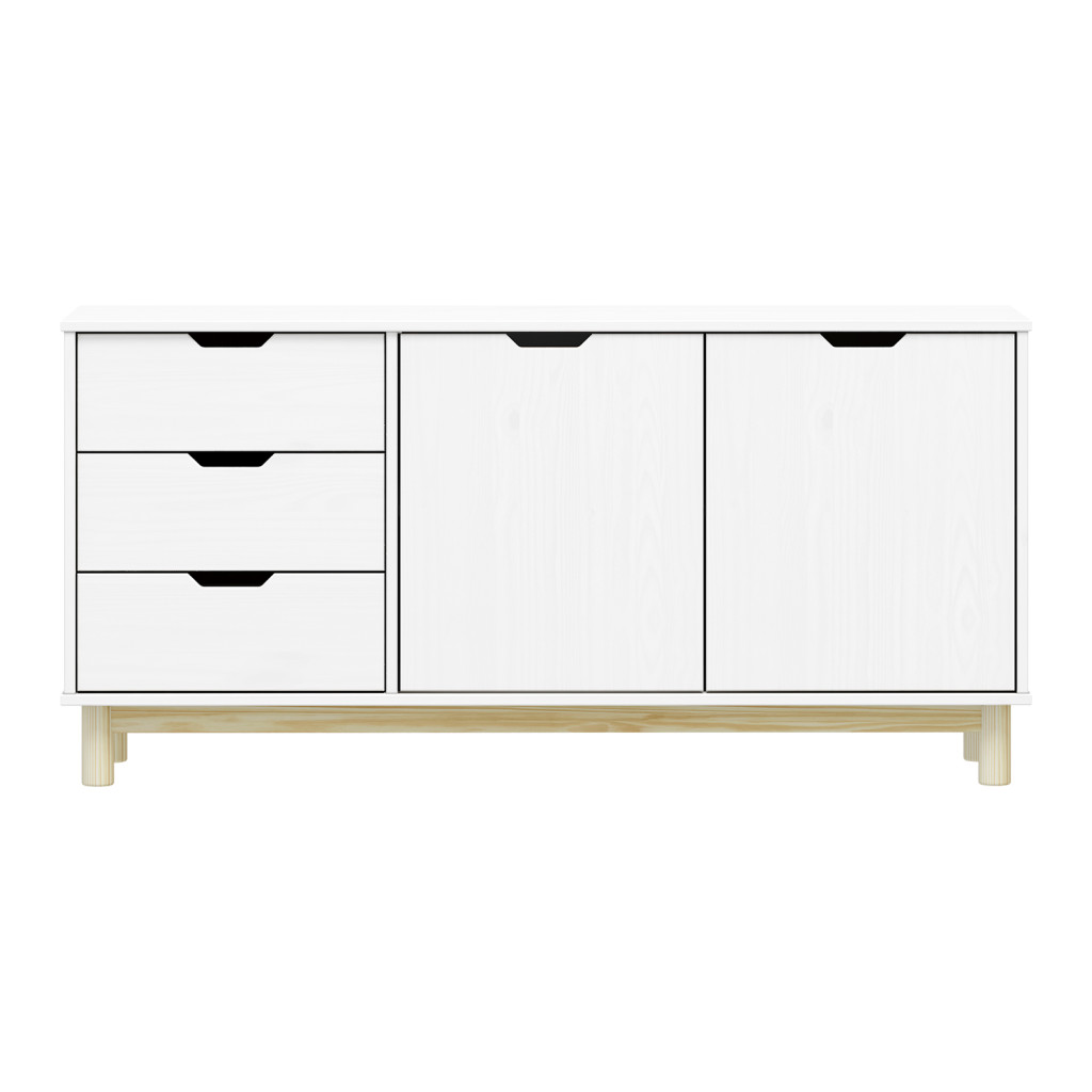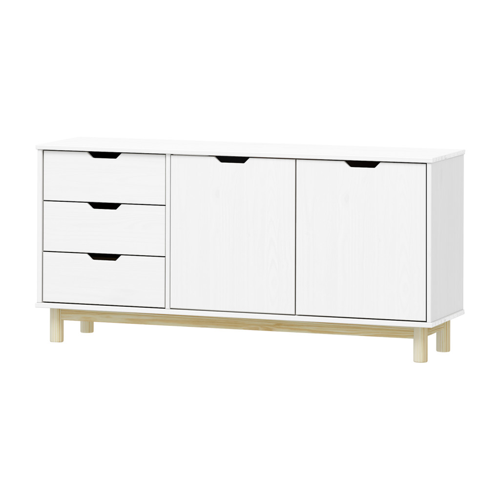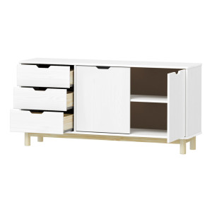 Dotaz na produkt Na splátky ještě dnesmateriál masiv borovice, barevné provedení bílý lak 3 zásuvky s kovovými pojezdy, 2 dvířka, 1 police