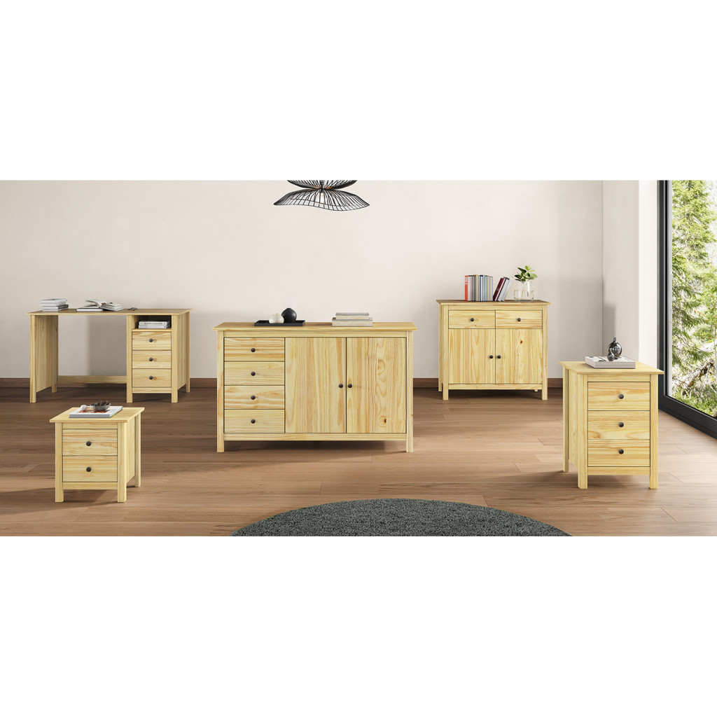Dotaz na produkt Na splátky ještě dnesmateriál masiv borovice, lakované provedení kovové úchytky v barevném provedení černěná mosaz 4 zásuvky s kovovými pojezdy, 2 plné dveře, 1 police