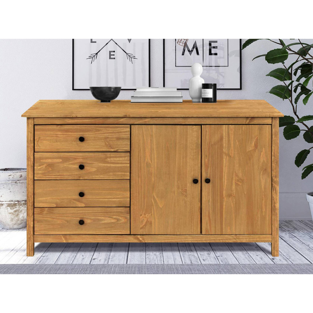 Dotaz na produkt Na splátky ještě dnesmateriál masiv borovice voskovaná v medovém odstínu kovové úchytky v barevném provedení černěná mosaz 4 zásuvky s kovovými pojezdy, 2 plné dveře, 1 police