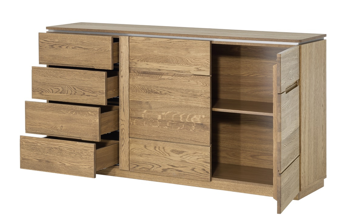 Dotaz na produkt Na splátky ještě dnesKomoda dvoudveřová. Jednoduché linie a kvalitní zpracování ve spojení s nadčasovým designem této řady dodají vaší jídelně nebo obývacímu pokoji jedinečný vzhled. Povrch vnějších částí je ošetřen olejem. Korpus je z vnější strany doplněn přírodní dubovou dýhou, vnitřní strana je z desky LTD v barvě přírodního dřeva. Komoda má v levé části 4 zásuvky. Dvířka jsou vyrobeny z masivního dubu rustikal. Úchyty jsou vyfrézované do přední desky. Dodáváme již ve smontovaném stavu.