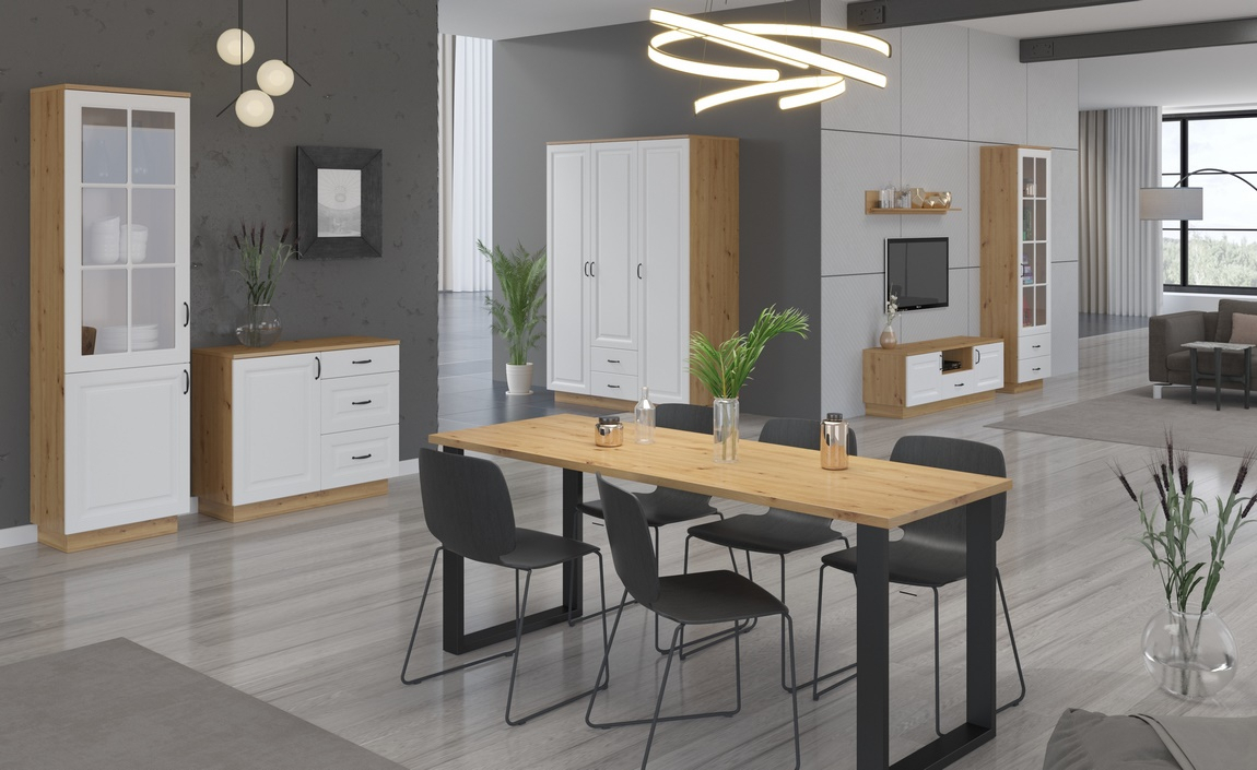 Dotaz na produkt Na splátky ještě dnesKomoda dvoudveřová se třemi zásuvkami v moderním provedení venkovského stylu. Korpus je vyroben z kvalitního lamina v barvě dub artisan, dvířka a čela zásuvek jsou vyrobena z desky MDF v barvě bílé. Úchyty jsou kovové černé. Dodáváme v demontovaném stavu.