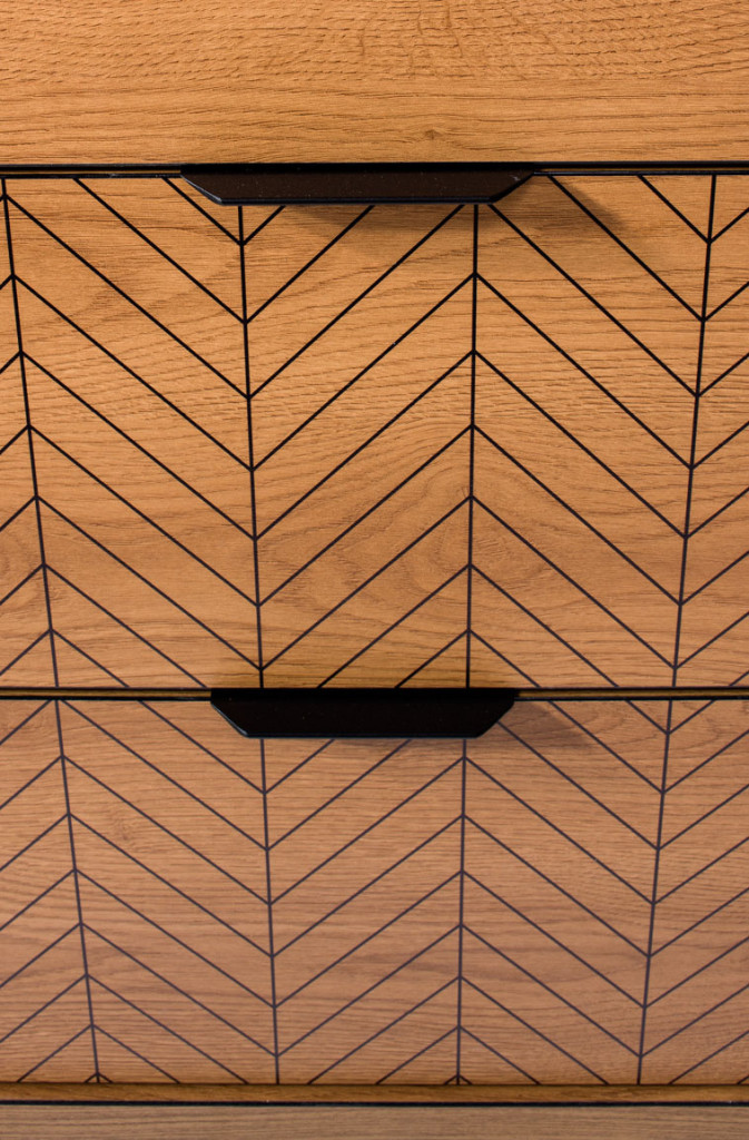 Komoda je vyrobena z kvalitních LTD desek. Jsou nenáročné na údržbu. Hrany jsou chráněny ABS hranou. Zadní část nábytku je z HDF desky.