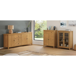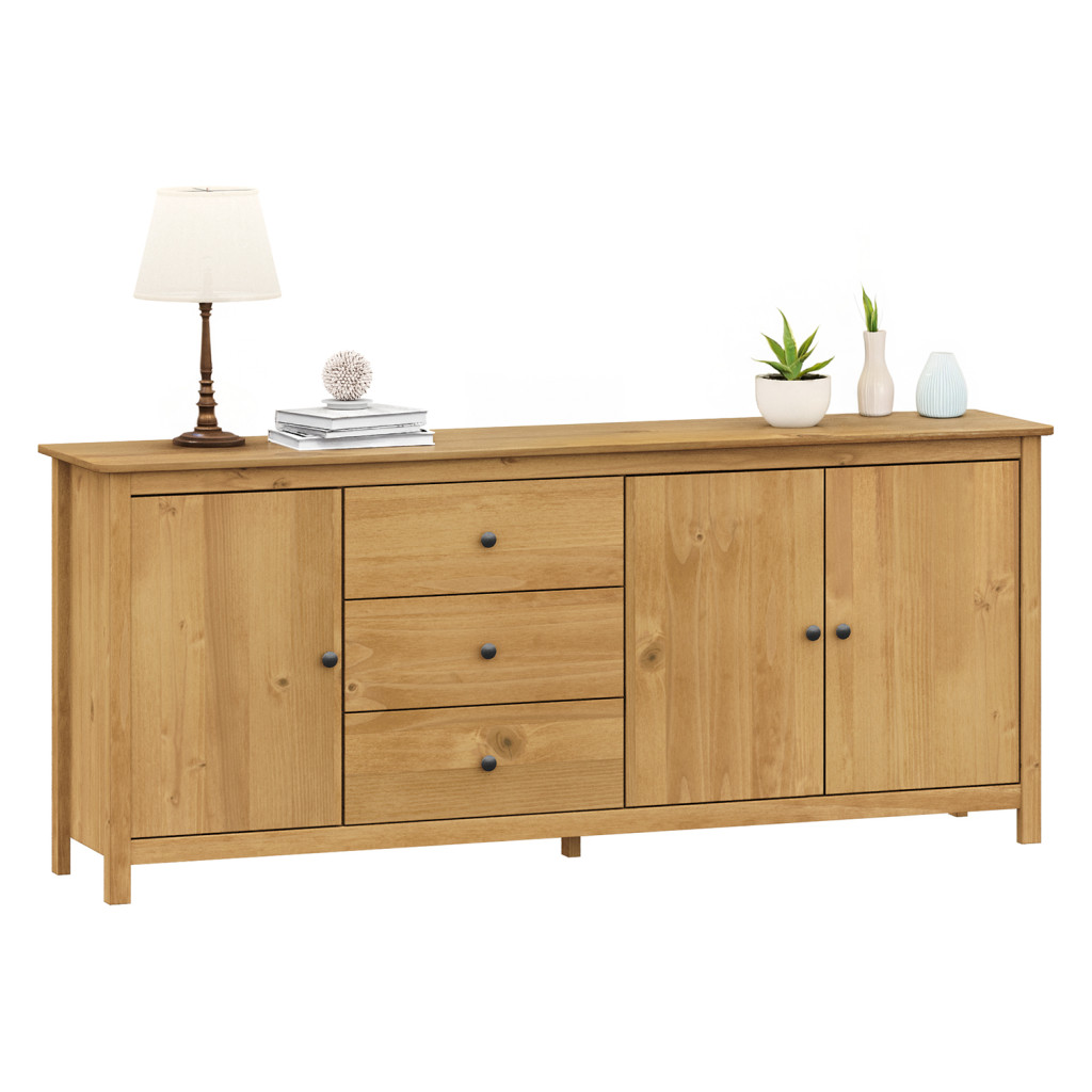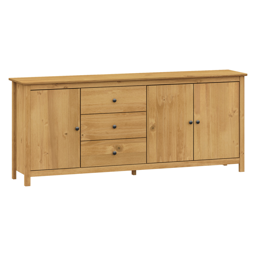 Dotaz na produkt Na splátky ještě dnesmateriál masiv borovice voskovaná v medovém odstínu kovové úchytky v barevném provedení černěná mosaz 3 zásuvky s kovovými pojezdy, 3 plné dveře, 2 police maximální nosnosti uvedeny v návodu k montáži