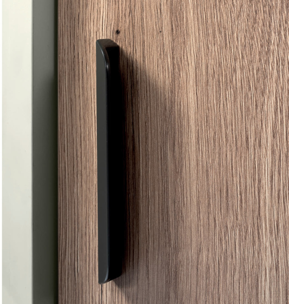 Úchytky: Moderní plastové v tmavém kovovém vzhledu.