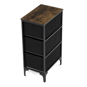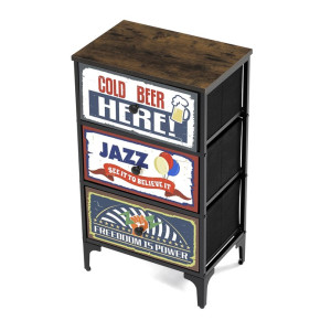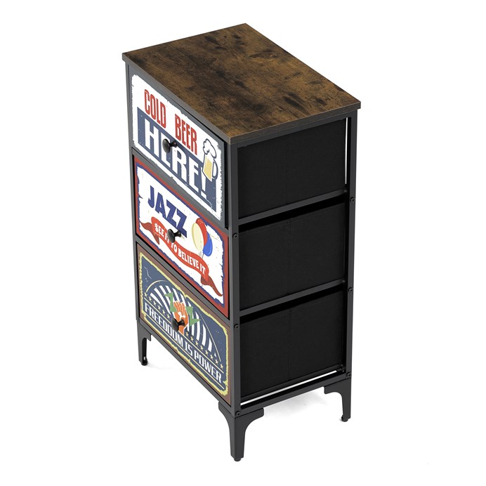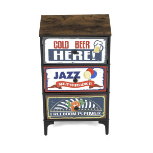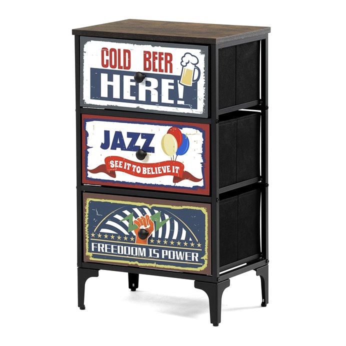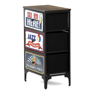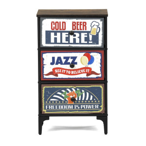 Dotaz na produkt Na splátky ještě dnesRetro komoda značky Autronic přinese do vašeho interiéru jedinečný styl a originalitu. Textilní čela zásuvek s výplní HDF a vintage potiskem navozují atmosféru starých amerických barů a jazzových klubů. Kombinace černé kovové konstrukce, desky v dekoru starého dřeva a zdobných noh dodává nábytku robustní, ale zároveň elegantní vzhled. Korpus zásuvek je vyroben z netkané textilie s výplní HDF, což zajišťuje jejich lehkost a snadnou manipulaci. Ideální doplněk do obývacího pokoje nebo stylové kavárny, kde se stane nepřehlédnutelným prvkem.