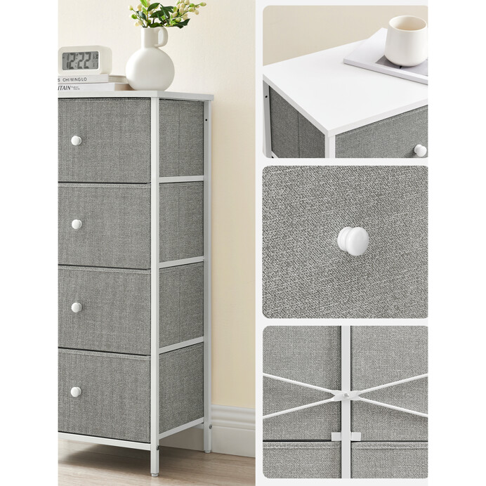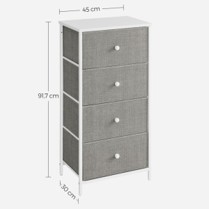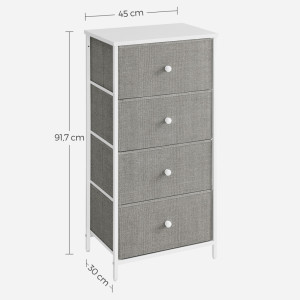 Dotaz na produkt Na splátky ještě dnesKomoda o rozměrech 45x30x92 cm kombinuje pevnou MDF desku s matnou povrchovou úpravou v bílé barvě a stabilní kovovou konstrukci nohou. Čtyři prostorné zásuvky z netkané textilie v šedém odstínu poskytují praktický úložný prostor pro různé drobnosti a zároveň usnadňují organizaci. Jednoduchý design s decentními bílými úchytkami ladí s moderním i skandinávským stylem interiéru. Komoda je navržena tak, aby byla lehká a zároveň dostatečně pevná pro každodenní použití. Díky kompaktním rozměrům se hodí do menších prostor, kde je potřeba efektivně využít místo.