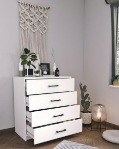 Dotaz na produkt Na splátky ještě dnesKomoda se čtyřmi zásuvkami je vyrobena z kvalitní desky LTD tl. 18 mm v barevném provedení bílá. Dodáváme v demontovaném stavu.
