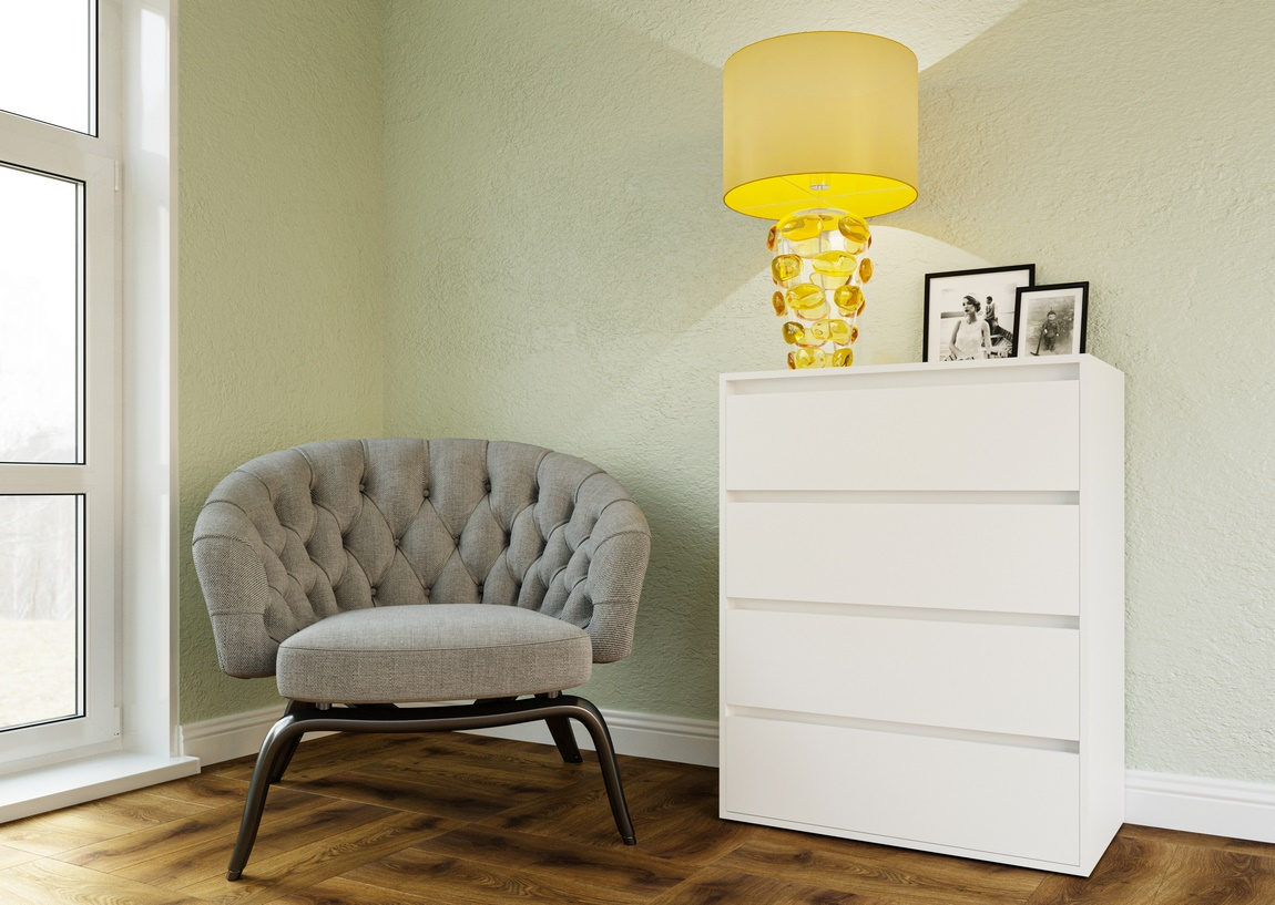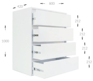 Dotaz na produkt Na splátky ještě dnesKomoda se čtyřmi zásuvkami je vyrobená z kvalitní laminátové desky v barevném provedení bílá (NImfea alba). Zásuvky jsou bezúchytové. Dodáváme v demontovaném stavu.