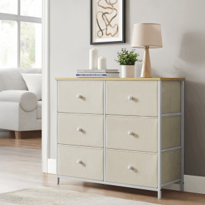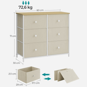 Komoda o rozměrech 80x30x71 cm kombinuje pevnou MDF desku s dubovým dekorem a matnou povrchovou úpravou s robustním kovovým rámem a nohami v bílé barvě. Šest prostorných zásuvek z netkané textilie v béžovém odstínu nabízí praktický úložný prostor pro různé drobnosti a zároveň přispívají k lehkému a vzdušnému vzhledu komody. Kovová konstrukce zajišťuje stabilitu a dlouhou životnost, zatímco MDF deska je snadno udržovatelná a odolná vůči běžnému opotřebení. Komoda je vhodná do moderních i minimalistických interiérů, kde oceníte její funkčnost i nenápadný design.