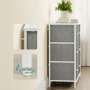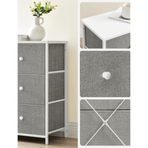 Komoda o rozměrech 80x30x71 cm kombinuje pevnou MDF desku s matnou bílou povrchovou úpravou a stabilní kovovou konstrukcí v šedé barvě. Šest prostorných zásuvek z netkané textilie nabízí praktické úložné řešení s jednoduchým přístupem díky kulatým úchytkům. Kovové nohy zajišťují stabilitu a odolnost, zatímco lehká látková provedení zásuvek usnadňují manipulaci a přispívají k vzdušnému vzhledu komody. Díky kompaktním rozměrům je vhodná do menších prostor, kde poskytuje dostatek místa pro organizaci drobných předmětů i textilu.