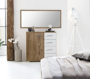 Dotaz na produkt Na splátky ještě dnesKomoda v krásném elegantním provedení z ložnicové kolekce PAMELA. Komoda má 1 dvířka a 4 praktické zásuvky.Korpus i dvířka jsou z kvalitní LTD v barvě divoký dub ( dubové prkna ) v kombinaci s alpskou bílou. Ložnicová sestava PAMELA se skládá z několika různých prvků nábytku a to Vám dává možnost sestavit si ložnici podle svých vlastních představ. Dodáváme v demontovaném stavu. DOPRODEJ!