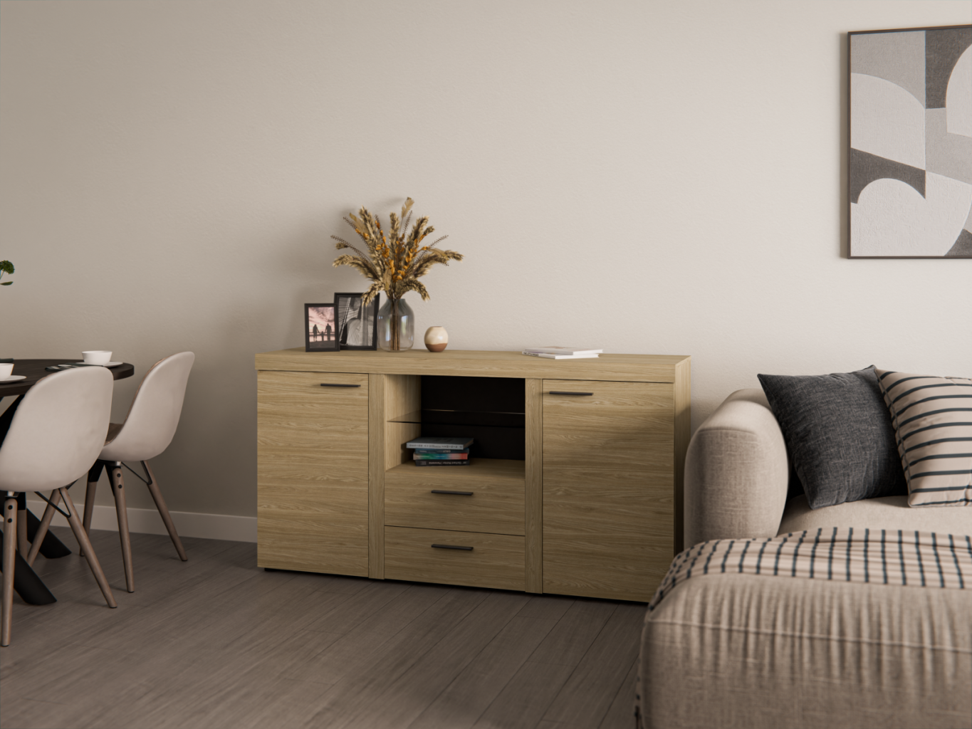 Dotaz na produkt Na splátky ještě dnesKomoda Rizo je nejen skvělým doplňkem k bytové stěně Rizo. Stejně výborně poslouží jako samostatný kus nábytku. Komoda má univerzální využití a nabízí dostatek úložného prostoru. Komoda je vyrobena z odolného a stálobarevného lamina. Komoda je dodávaná v demontu. Součástí balení je schematický montážní návod, včetně všech potřebných spojovacích prvků. Vyobrazené doplňky, LED osvětlení a dekorace nejsou v ceně.