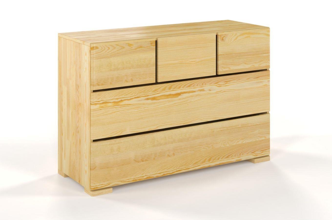 Jednoduchá komoda s pěti zásuvkami a hladkou přední částí z kolekce Sandemo. Masivní kus nábytku se díky svému jednoduchému designu jeví jako lehký a stabilní. Visby Sandemo byl navržen s ohledem na moderní evropské ložnice. Vypadá skvěle ve velkých i malých útulných pokojích.