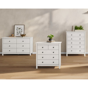 Dotaz na produkt Na splátky ještě dnesmateriál masiv borovice, barevné provedení bílý lak kovové úchytky v barevném provedení černěná mosaz 2 menší a 3 větší zásuvky s kovovými pojezdy