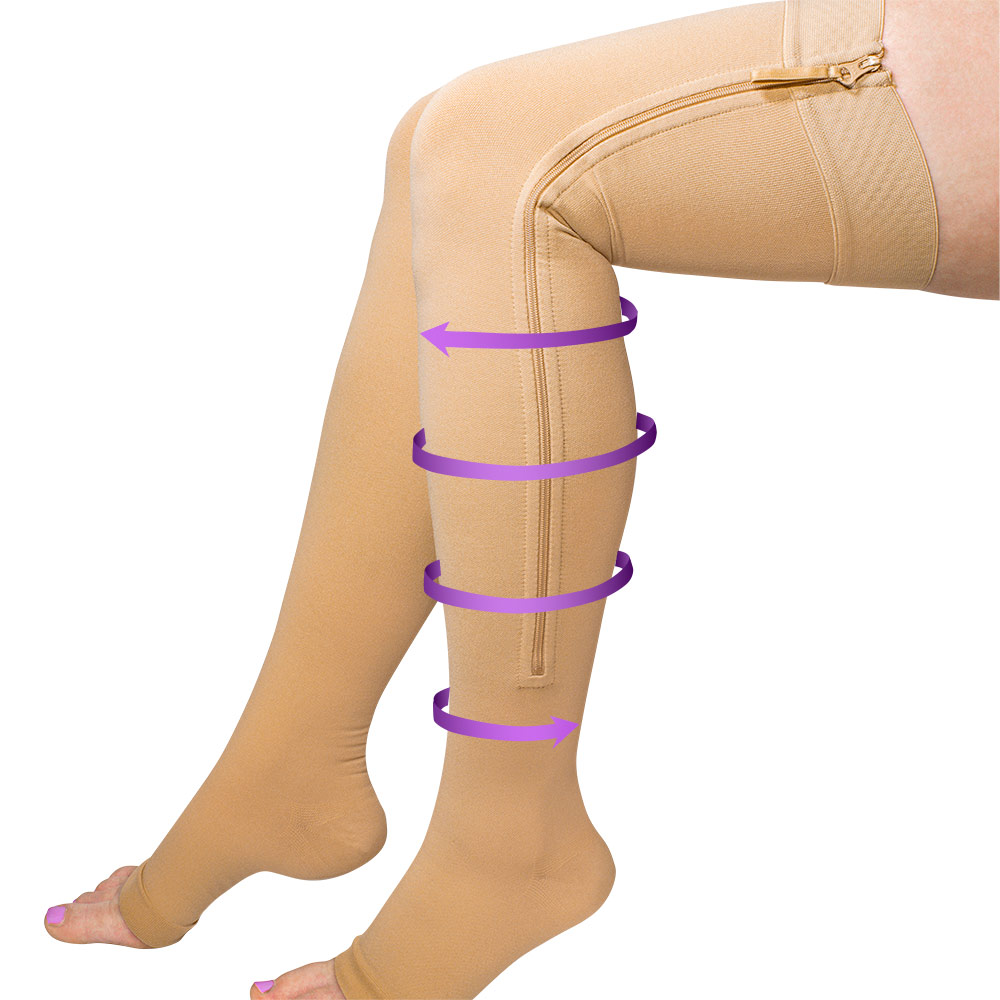 Oblékání kompresních ponožek, podkolenek nebo punčoch je většinou velmi namáhavé, těžko se navlékají na nohy. Kompresní stehenní punčochy mají praktický zip, lze je tedy snadno obléknout a svléknout. Kompresní stehenní punčochy uklidňují a revitalizují vaše nohy, pomohou zbavit se nepříjemných bolestí nohou a otoků.