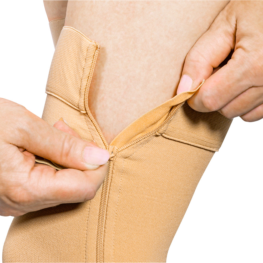 Oblékání kompresních ponožek, podkolenek nebo punčoch je většinou velmi namáhavé, těžko se navlékají na nohy. Kompresní stehenní punčochy mají praktický zip, lze je tedy snadno obléknout a svléknout. Kompresní stehenní punčochy uklidňují a revitalizují vaše nohy, pomohou zbavit se nepříjemných bolestí nohou a otoků.