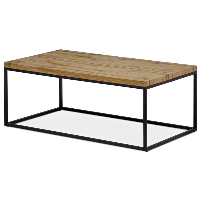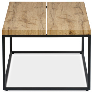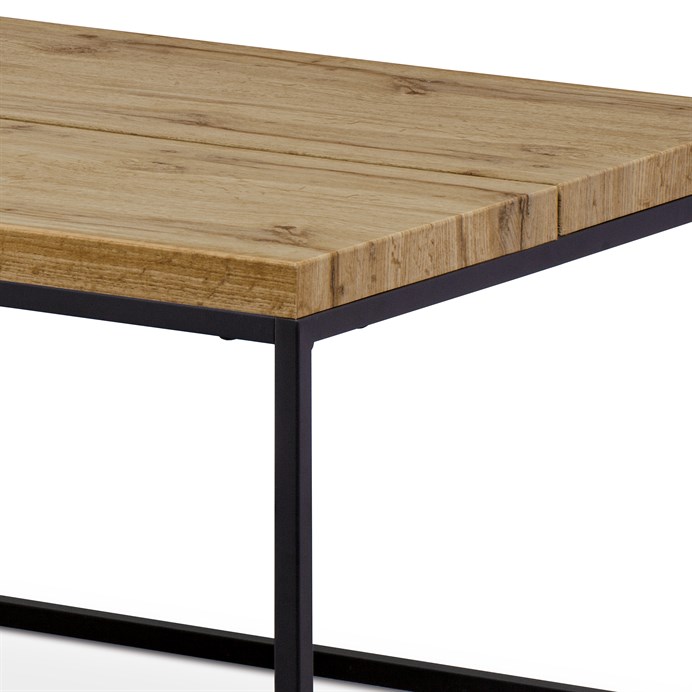 Konferenční stolek přinese do Vašeho domova trochu industriálního šarmu. Obdélníkovou desku z MDF v dekoru divoký dub harmonicky doplňuje minimalistická nosná konstrukce v černé barvě. Stolek zaujme i svým nadčasovým a strohým designem.