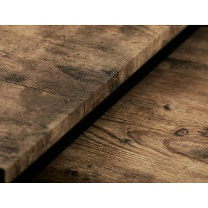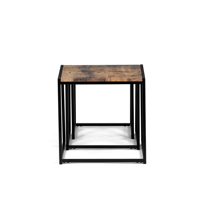 Čtvercové desky z MDF v dekoru staré dřevo harmonicky doplňují černá kovová konstrukce, která tvoří rovněž nohy a celkově stolky zpevňuje. Stolek jistě zaujmou nejen svým nadčasovým designem, ale i variabilitou a praktičností.