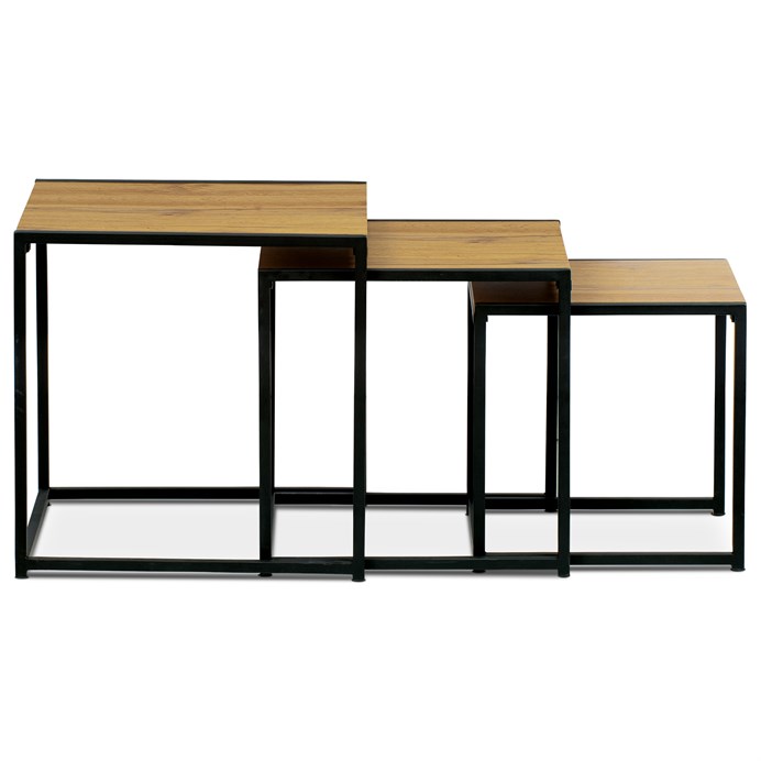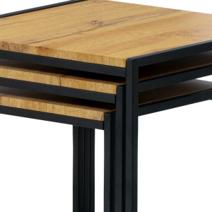 Set tří odkládacích stolků AF-3003 OAK kombinuje pevnou MDF desku s dekorativním povrchem v odstínu divokého dubu a stabilní kovovou podnož v černém laku. Stolky jsou navrženy tak, aby se daly elegantně zasunout jeden pod druhý, což šetří prostor a umožňuje variabilní využití v interiéru. Minimalistický design s tenkými kovovými rámy podtrhuje moderní industriální styl a přírodní dekor desek přináší do prostoru teplý a přirozený vzhled. Každý stolek je vhodný pro odkládání drobných předmětů, květin nebo jako doplněk k sedací soupravě. Rozměry jednotlivých stolů umožňují snadnou manipulaci a jejich kvalitní zpracování zaručuje dlouhou životnost.