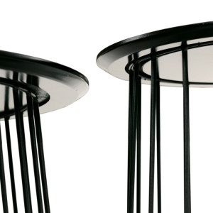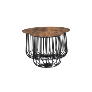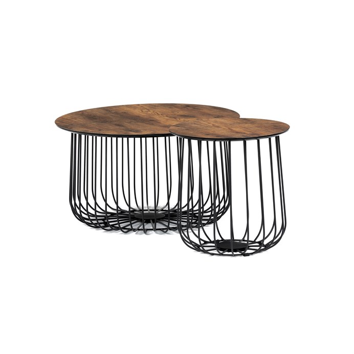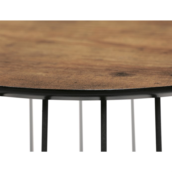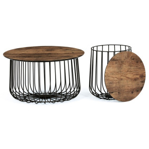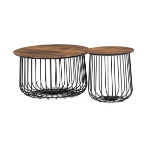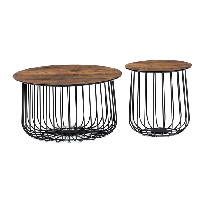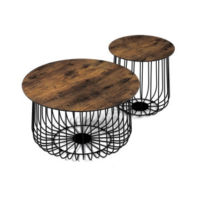 Stolky jsou v lehkém minimalistickém designu ve velmi oblíbeném industriálním stylu. Desky jsou z MDF tl. 18 mm, ze spodní části v černém matu se sraženou obvodovou hranou a v horní pohledové v 3D dekoru staré dřevo. Drátěná kovová konstrukce ze subtilních kulatých profilů je v černém matu, povrchová úprava je kvalitním práškovým vypalovacím lakem. Ve spodní části jsou gumové patky, které zamezují poškození povrchu tvrdých podlah a zároveň zabraňují i nechtěnému posunu stolků.