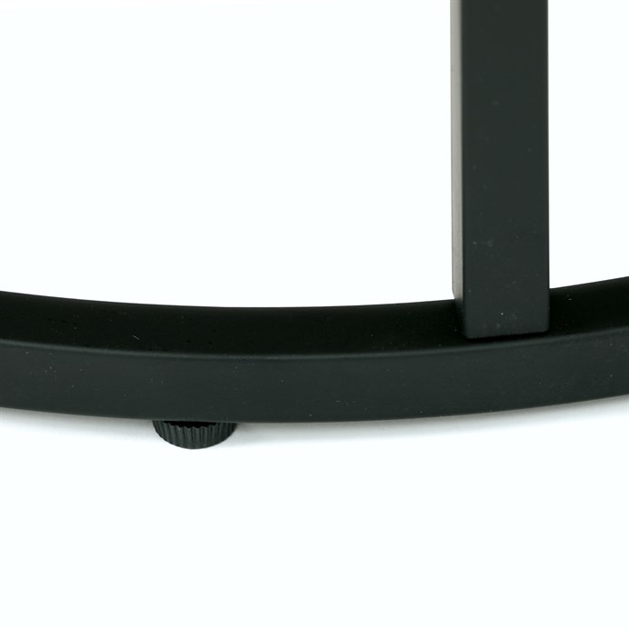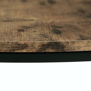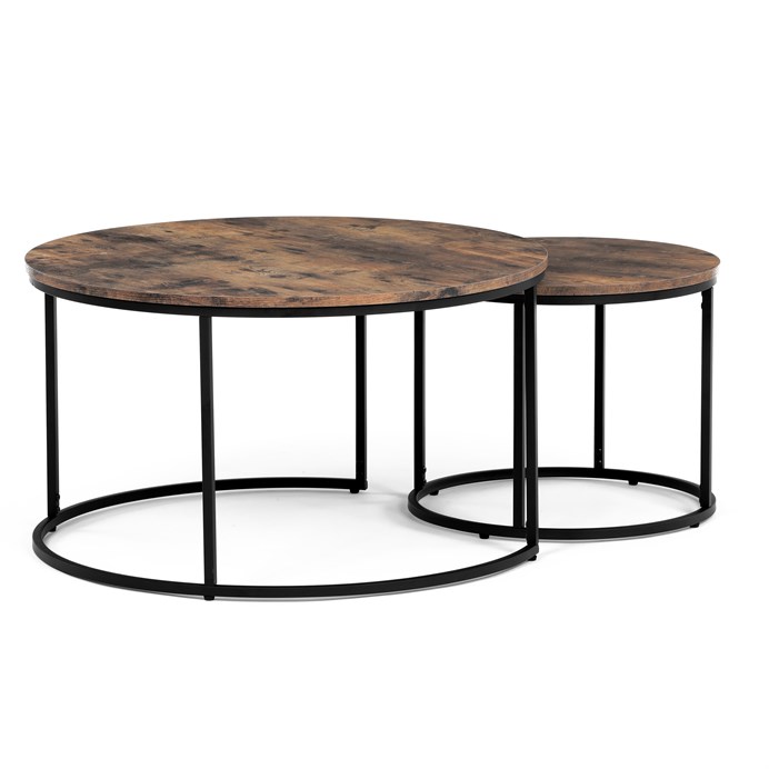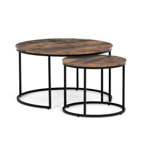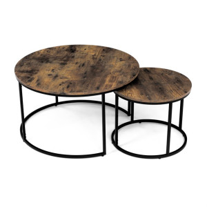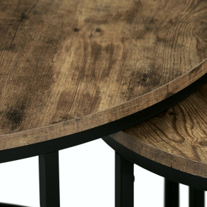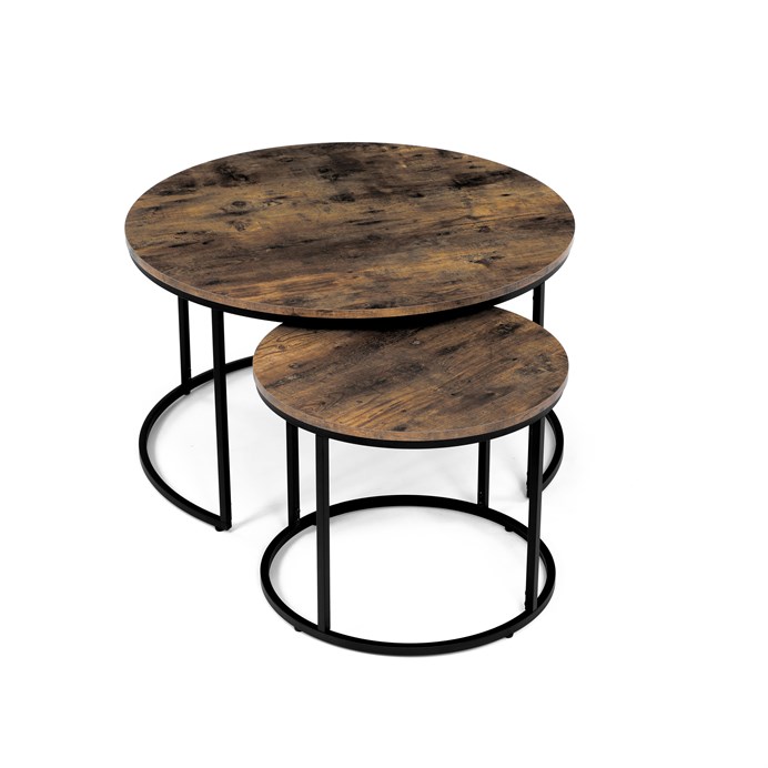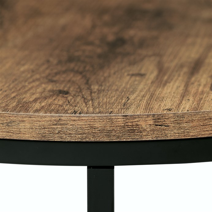 Kulaté desky z MDF v dekoru staré dřevo harmonicky doplňuje kovová konstrukce po jejich obvodu v černém matném práškovém nástřiku. Ta tvoří rovněž nohy a celkově stolky zpevňuje. Na spodní liště jsou umístěny černé plastové kluzáky, které zabraňují poškození povrchu podlahy při přesunech stolků.