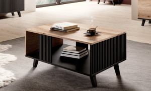Dotaz na produkt Na splátky ještě dnesKonferenční stolek z dubového dřeva s kombinací černé barvy. Materiál desky je dýhovaná MDF.