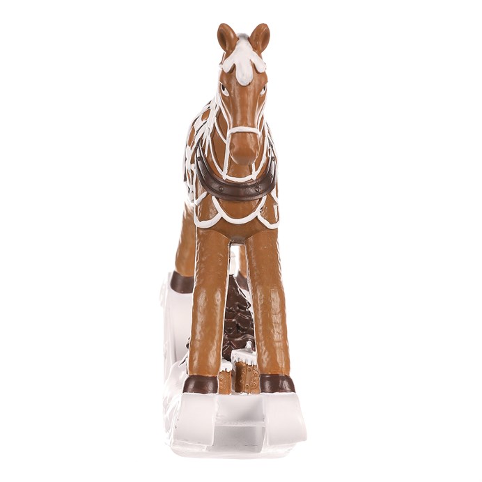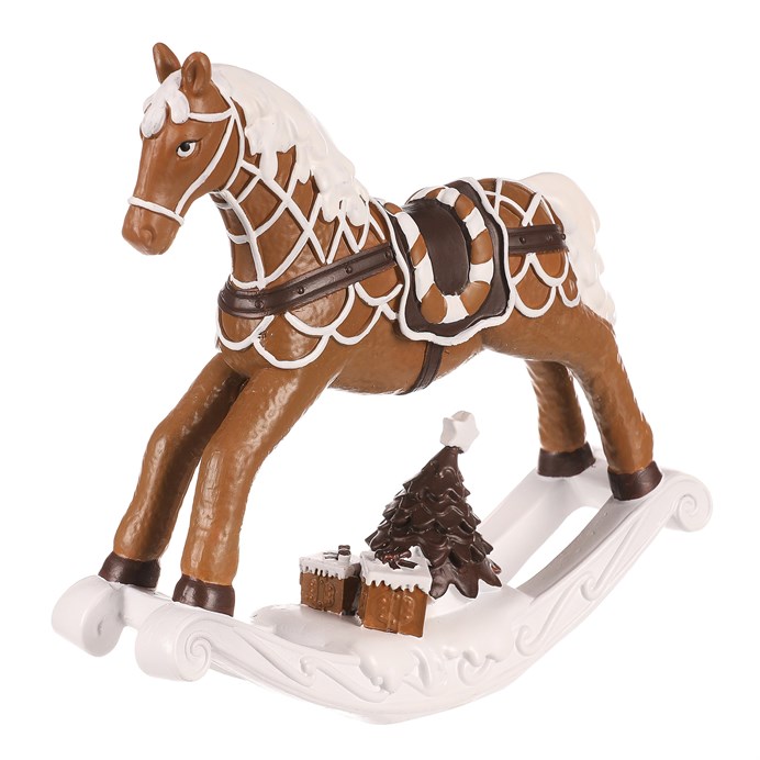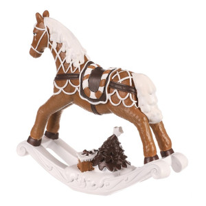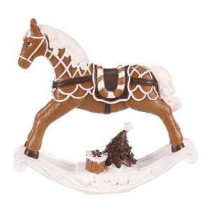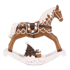 Dotaz na produktVyzdobte si o vánočních svátcích poličku, stůl, nebo jiný vhodný prostor, touto úžasnou soškou v podobě houpacího koníka z polyresinu. Vypadá, jako by však byl vytvořen z perníku, či marcipánu a vyzdoben sladkou polevou. Koník samotný je v hnědé barvě, má barevné osedlání, přičemž spodní část je celá v bílém a doplněna hnědými dárečky a vánočním stromkem.