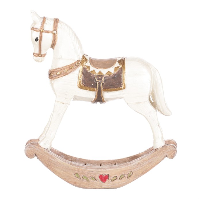 Dotaz na produktHoupací koník v bílo-hnědém provedení je vyroben z polyresinu, který věrně napodobuje dřevěnou strukturu a zajišťuje dlouhou životnost dekorace. Detailní zpracování zahrnuje propracované sedlo a uzdu v hnědých odstínech s jemnými zlatými akcenty. Stabilní základna umožňuje mírné houpání, které přidává dekoraci dynamiku a nostalgický efekt. Vynikne jako ozdoba dětského pokoje, obývacího prostoru nebo vintage stylu interiéru.