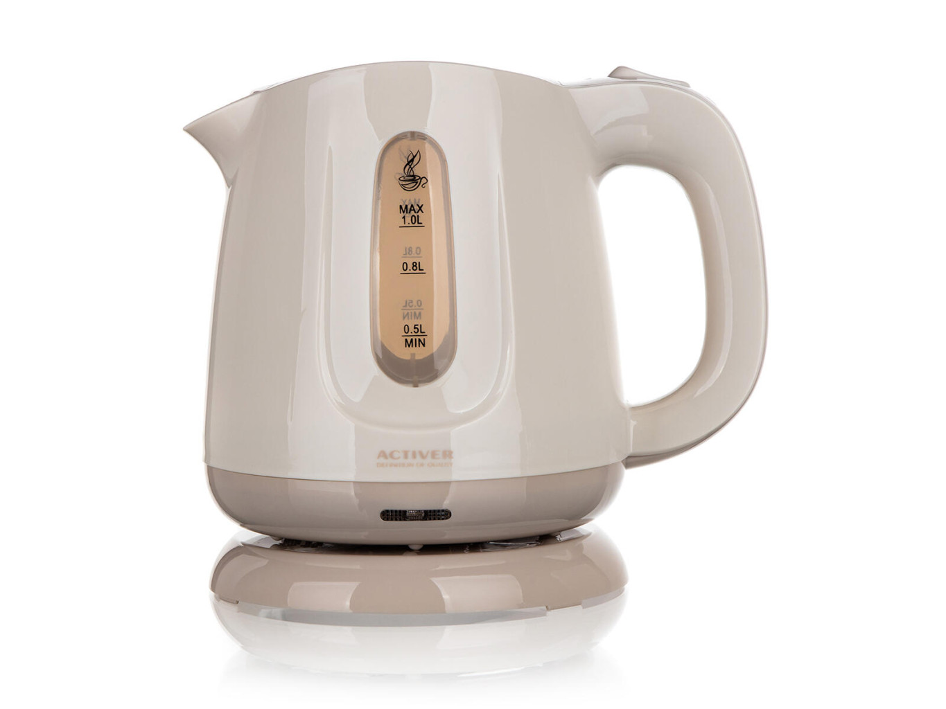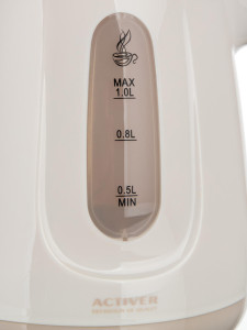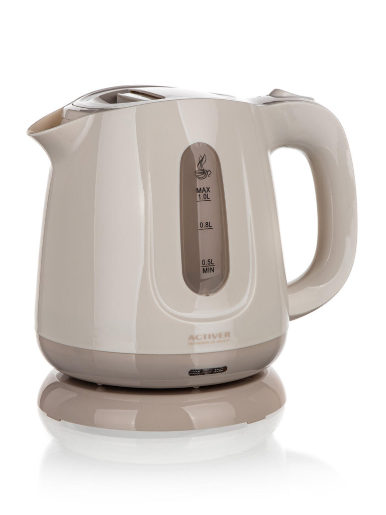 Plastová v moderním designu s průhledovým ukazatelem množství vody a ochranou proti přehřátí.