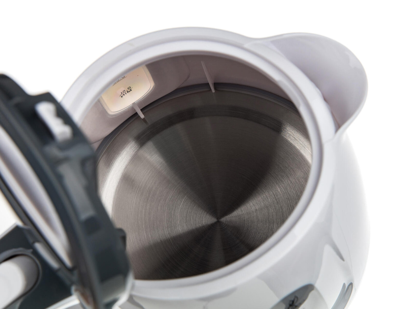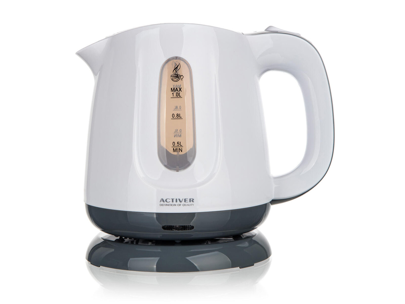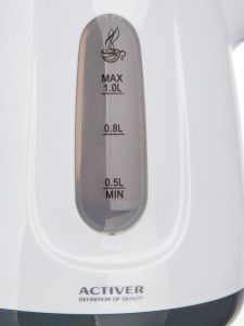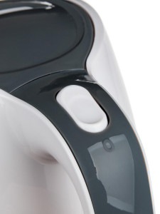 Plastová v moderním designu s průhledovým ukazatelem množství vody a ochranou proti přehřátí.