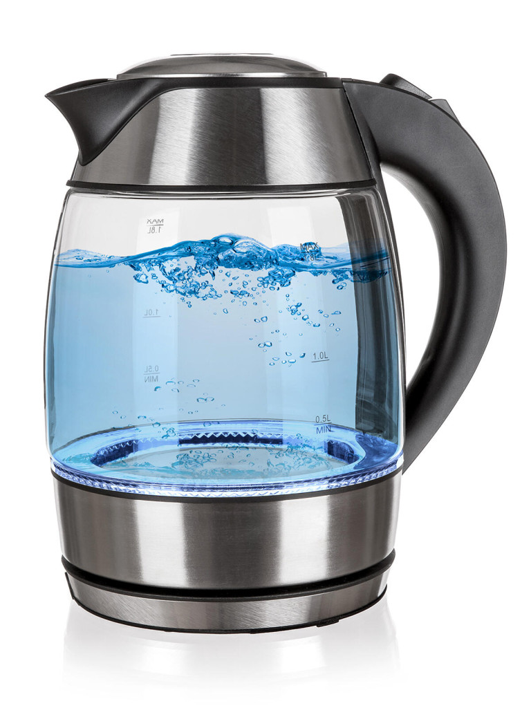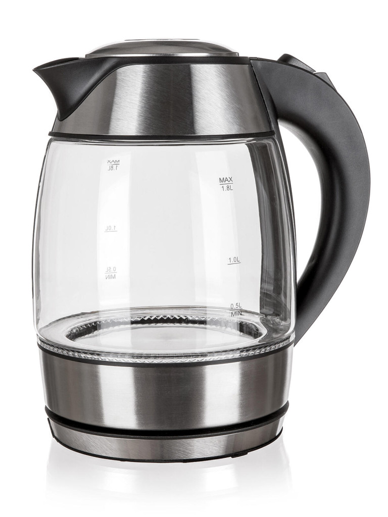 Moderní varná konvice s plochým dnem a skleněným tělem, o objemu 1,8 l, je nedílnou součástí každé kuchyně.