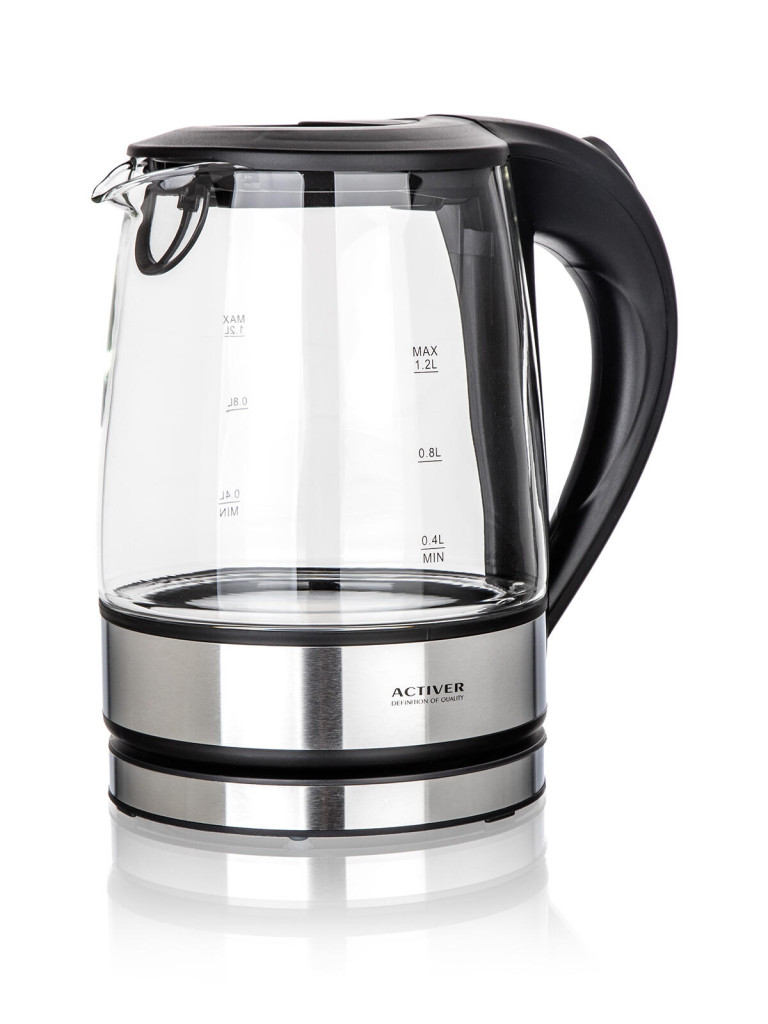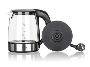 Moderní varná konvice MADDIE s plochým dnem a skleněným tělem, o objemu 1,2 l, je nedílnou součástí každé kuchyně.
