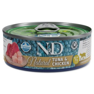 Tuňák žlutoploutvý (50 %), kuřecí filet (20 %), vývar.